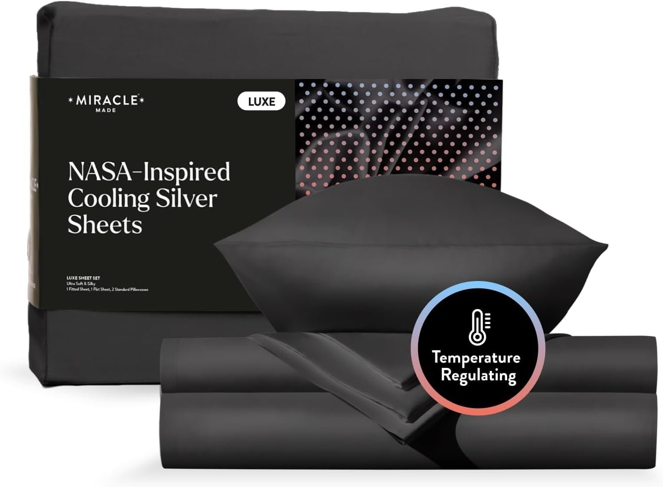A: Miracle Made® Luxe Cooling Bed Sheets are crafted from a unique blend of NASA-inspired silver ion Lyocell fabrics and eucalyptus fibers. This innovative combination provides advanced temperature regulation, ensuring that you stay at a comfortable temperature throughout the night. The silver infusion not only enhances the softness of the sheets but also helps in keeping them cleaner for longer, making them ideal for sensitive skin.